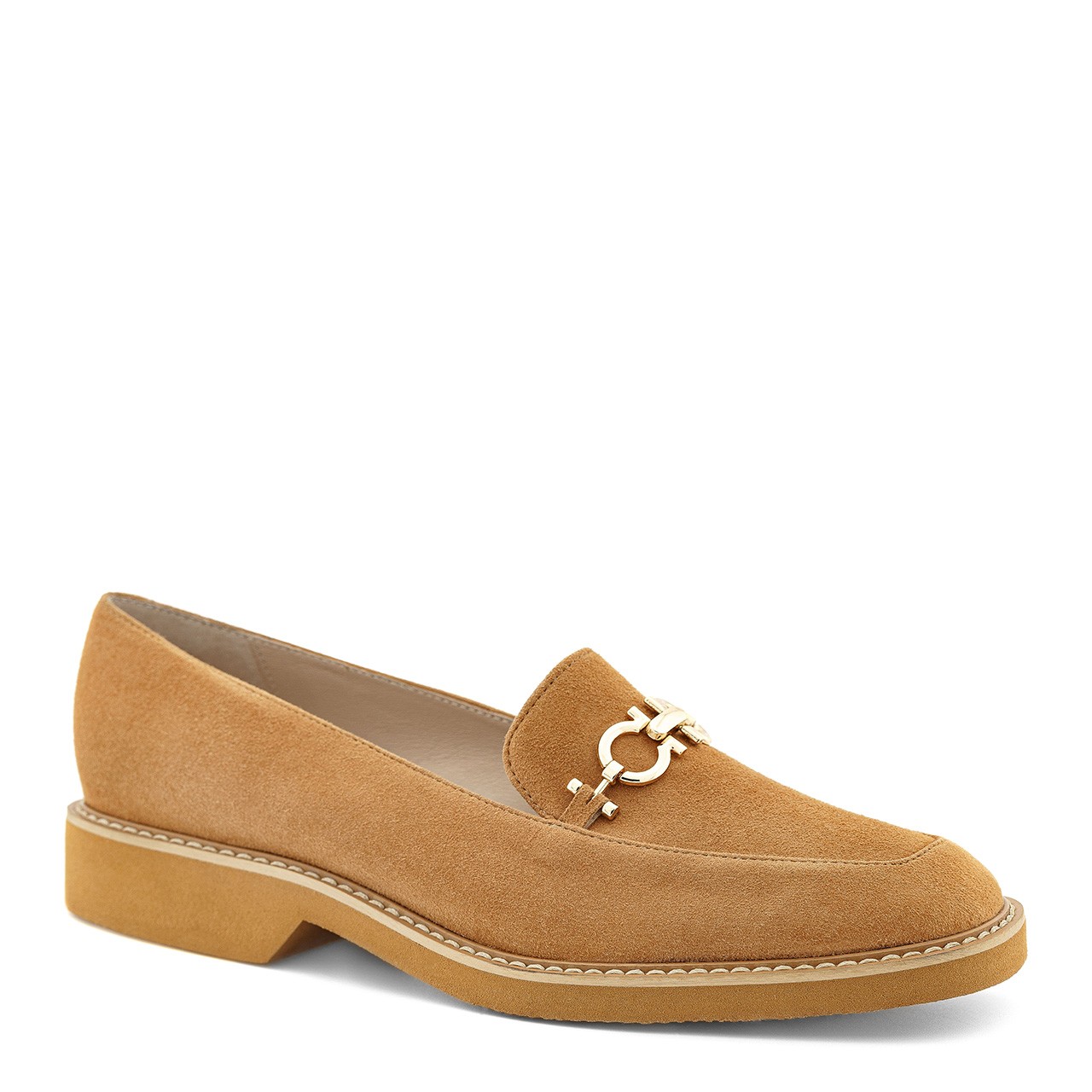 Toffee-colored moccasins for women with a thick sole and a decorative chain at the front