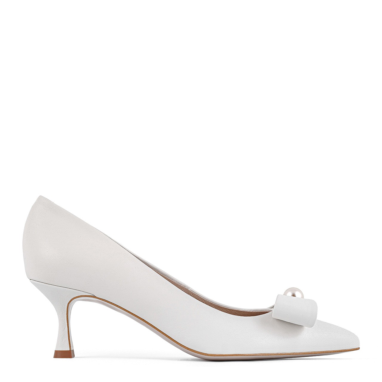 Białe skórzane czółenka ślubne ozdobiono kokardką z perełką, która stanowi romantyczny akcent idealnie pasujący do ślubnych stylizacji. To subtelne zdobienie nadaje obuwiu wyjątkowego charakteru, doskonale komponując się z białą suknią ślubną i delikatnymi dodatkami.